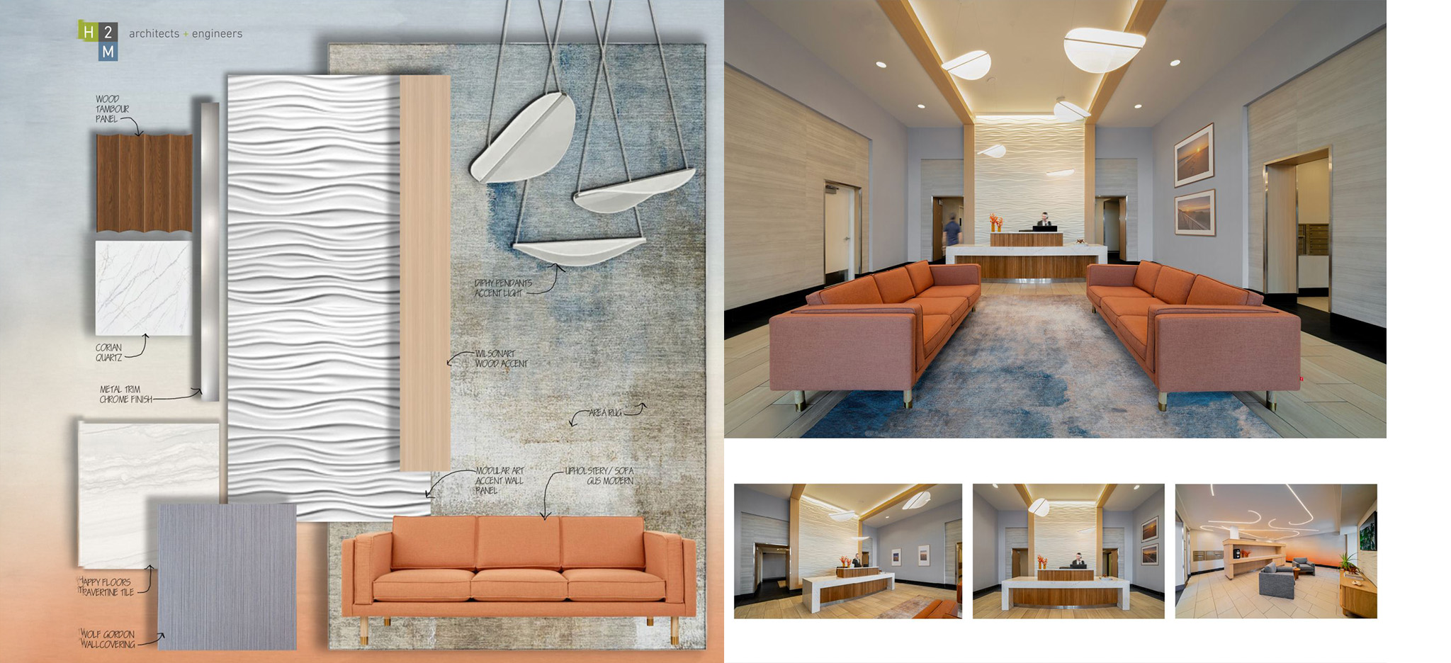 H2M’s Interior Design team transformed a Long Beach lobby into a bright, coastal‑inspired space that reflects the energy of the nearby boardwalk and shoreline. Light materials, warm wood accents, and nature‑driven textures bring a renewed sense of wellness to a once outdated space. Explore more of our interior design work in our ongoing material board series. Read More.